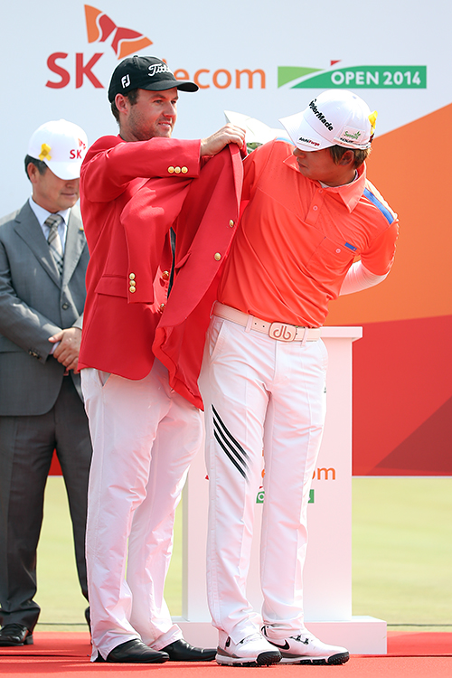 디펜딩챔피언 메튜그리핀에게 우승쟈켓을 입는 김승혁
