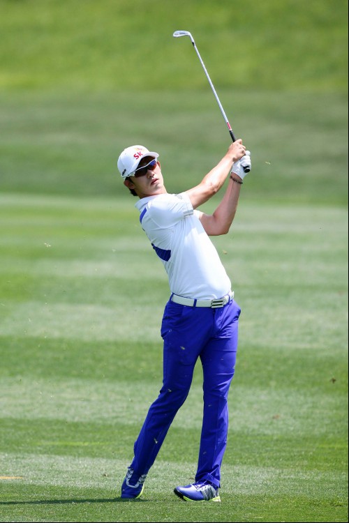 김비오 선수가 10번홀 세컨샷을 하고 있다.