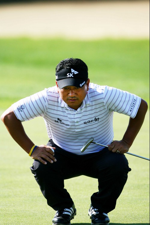 최경주 선수가 1번홀 퍼팅라이를 보고 있다.