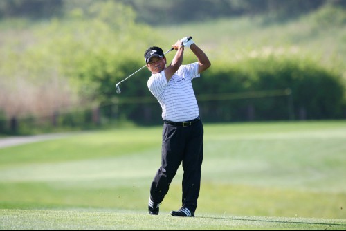 최경주 선수가 2번홀 세컨샷을 하고 있다.