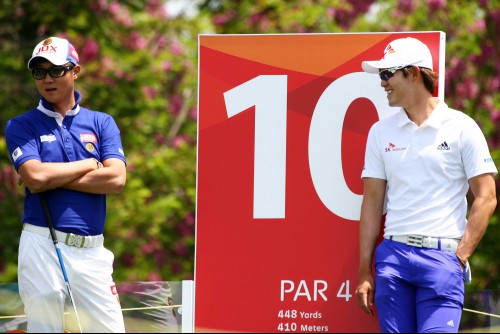 허인회 선수와 김비오 선수가 10번홀 출발 전 담소를 나누고 있다.