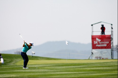 홍순상이 11번홀 세컨샷을 하고 있다.