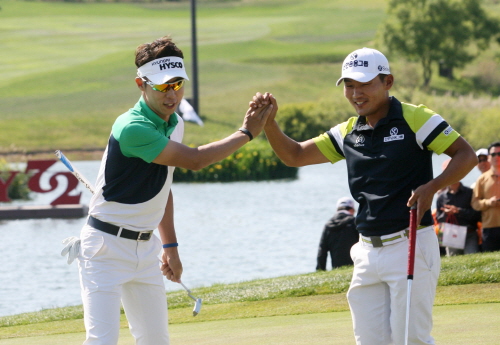 최진호가 마지막라운드에서 18번홀 챔피언퍼트 성공 후 강성훈과 하이파이브를 하고 있다.