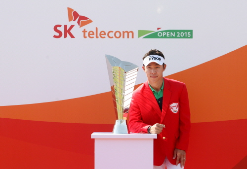 최진호가 마지막라운드에서 우승 트로피를 들고 포즈를 취하고 있다.