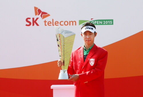 최진호가 마지막라운드에서 우승트로피를 들어보이고 있다.