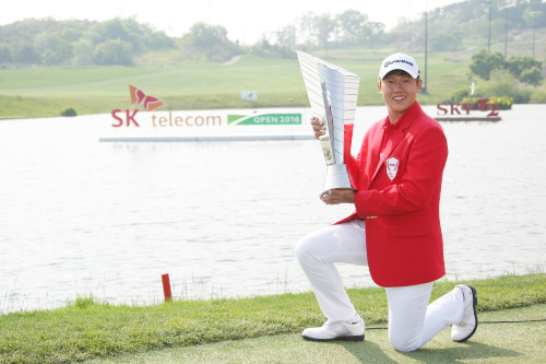 이상희가 마지막라운드에서 우승트로피를 들고 포즈를 취하고 있다.