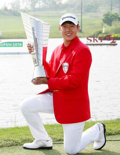 이상희가 마지막라운드에서 우승트로피를 들고 포즈를 취하고 있다.