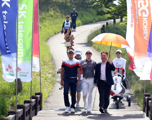 18번홀 티그라운드 이동중 미소짓는 프로들
