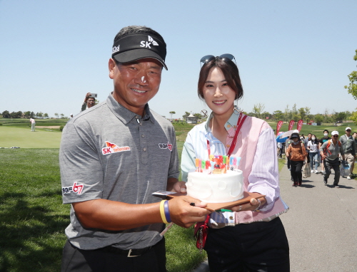9번홀 홀아웃후 김하늘프로 에게 케익을 전달받는 최경주프로