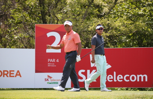 2번홀 티그라운드 볼의 방향을 살피는 최경주 박상현프로