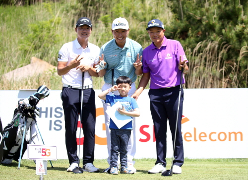 1번홀 갤러리 어린이와 기념 사진 찍는 조성민,문경준,최이삭