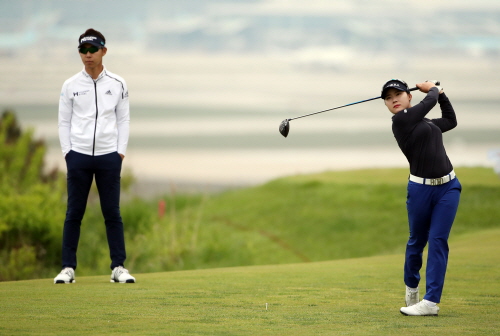 재능 나눔 행복라운드 이벤트-3번홀 국가대표 서어진 드라이버 티샷 바라보는 최진호프로