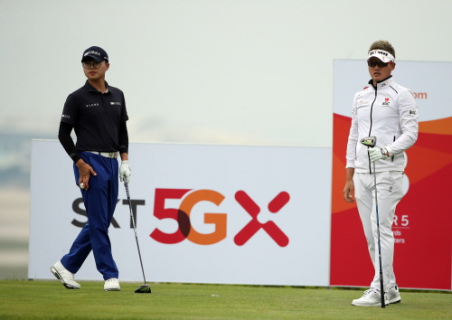 재능 나눔 행복라운드 이벤트-3번홀 티샷후 볼의 방향 바라보는 이태희프로와 국가대표 오승현선수