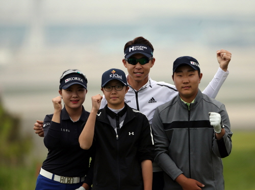 재능 나눔 행복라운드 이벤트-화이팅포즈를 취하고 있는 좌 국가대표 서어진 김가희 최진호프로 문동현