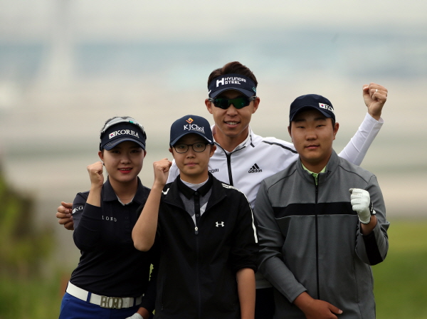 3번홀 화이팅포즈를 취하고 있는 좌 국가대표 서어진 김가희 최진호프로 문동현