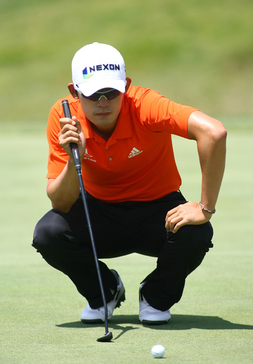 김비오 9번홀 퍼팅라이 보는 모습