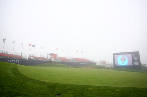 안개로 뒤덮힌 18번홀 그린 전경
